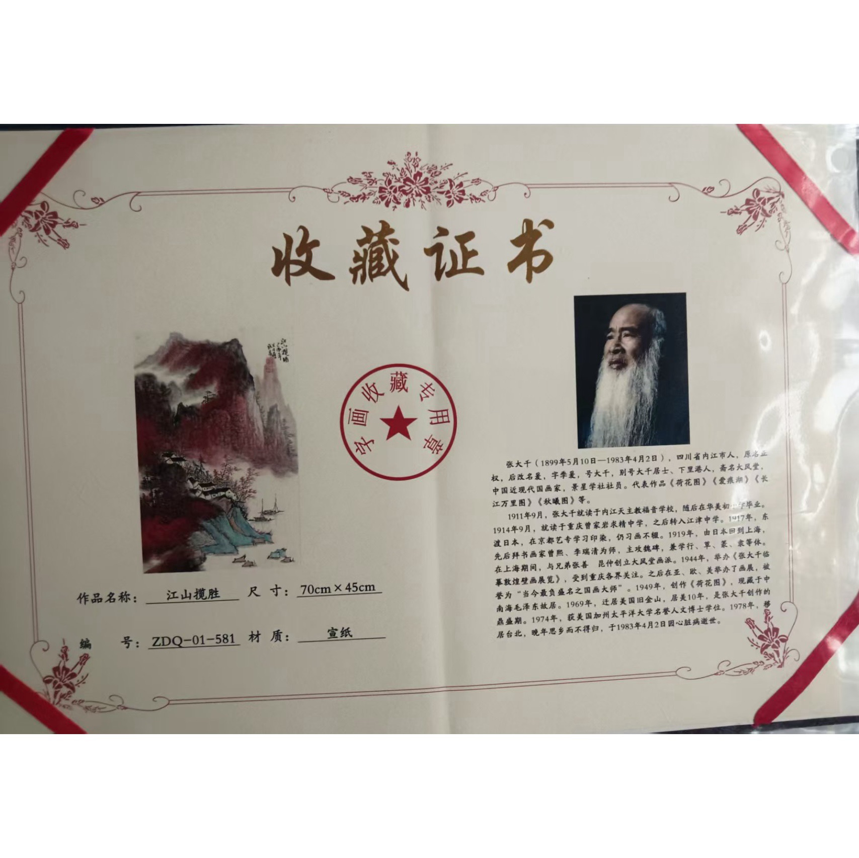 存世垄断:历经半个多世纪的艺术市场洗礼、国际流转与自然损耗,完整流传且品相上佳的张大千泼彩山水全球存世量不足 50 幅。这幅《江山揽胜》“45×70cm、品相绝品”,是 **“存世垄断型”** 收藏标的,属于 “可遇不可求” 的孤品神话;
