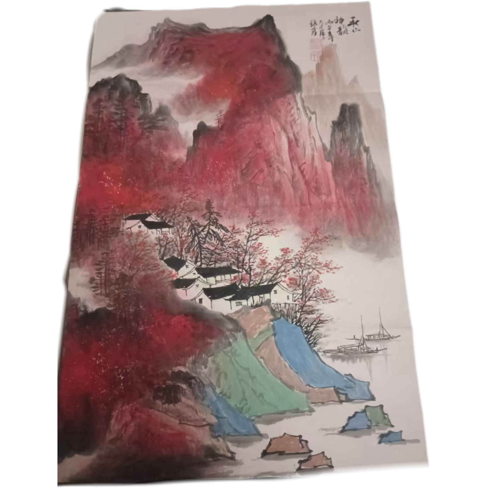技法颠覆:采用 **“泼彩泼墨融合式革命技法”,画面中红色山峦以泼彩技法营造出 “层峦叠嶂、气象万千” 的视觉冲击,同时以传统笔墨精绘屋舍、扁舟、树木,实现 “泼彩不废笔墨,笔墨融于泼彩” 的完美平衡,是张大千泼彩技法的 “巅峰式” 体现,是“技法标杆型”** 收藏样本;