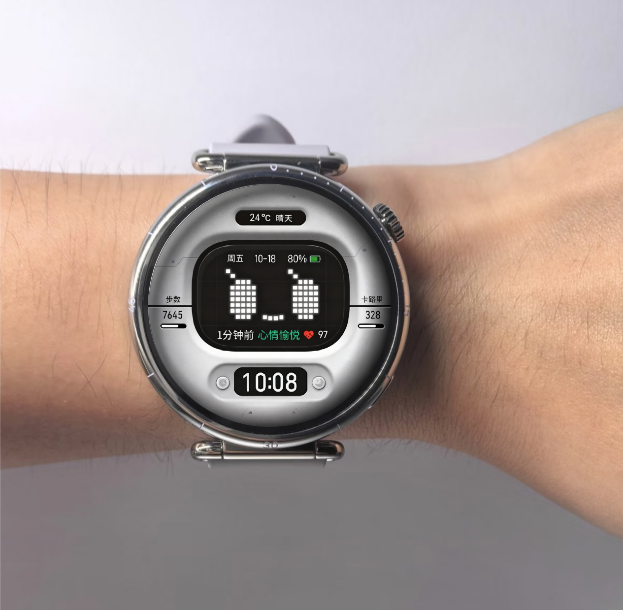 工作中感到疲惫时,一抬手,《情绪小助手》那圆润的仪表盘上可能正显示着一个慵懒的像素表情,仿佛在说“歇会儿吧”,这种无声的默契瞬间就能带来一丝慰藉。它中性又带点复古科技感的设计,像一位全天候的贴心伙伴,适合任何风格的你。