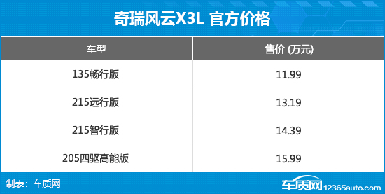9月17日,奇瑞风云X3L正式上市,新车共推出4款车型,售价区间11.99-15.99万元。同时,官方还推出全系10000元限时超级置换礼。新车定位为紧凑型SUV,采用增程动力,是一款“可城可野的”高能时尚户外方盒家族产品。