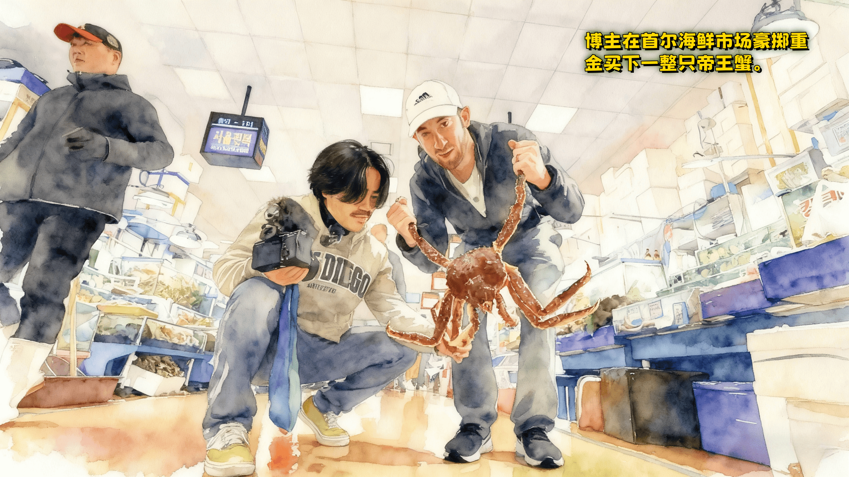 博主在首尔海鲜市场豪掷重金买下一整只帝王蟹。