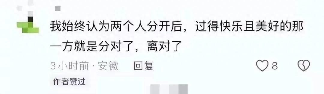 不过,网友却过度热情,有的还看热闹还嫌事不够大,跟帖:“我始终认为两个人分开后,过得快乐且美好的那一方就是分对了,离对了。”