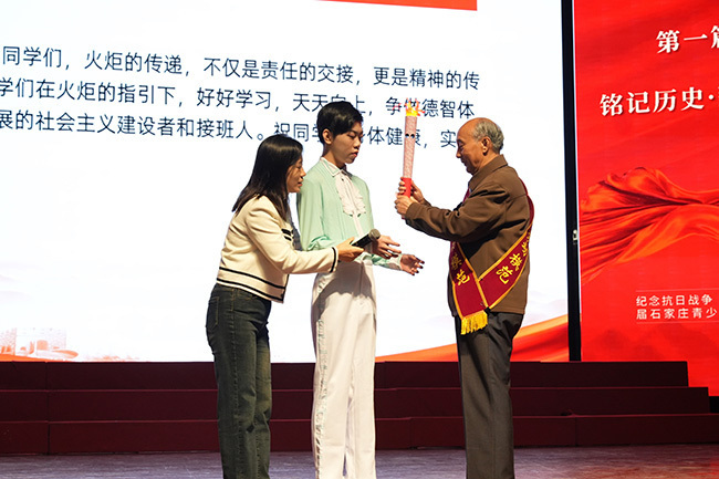 紧接着,石家庄市特殊教育学校学生代表梁紊衔从曹成群前辈手中接过象征革命精神的火炬,立下当代青少年奋发向上的誓言。随后,《红星歌》《天耀中华》等经典曲目响彻会堂,稚嫩却有力的童声将观众带回烽火岁月。