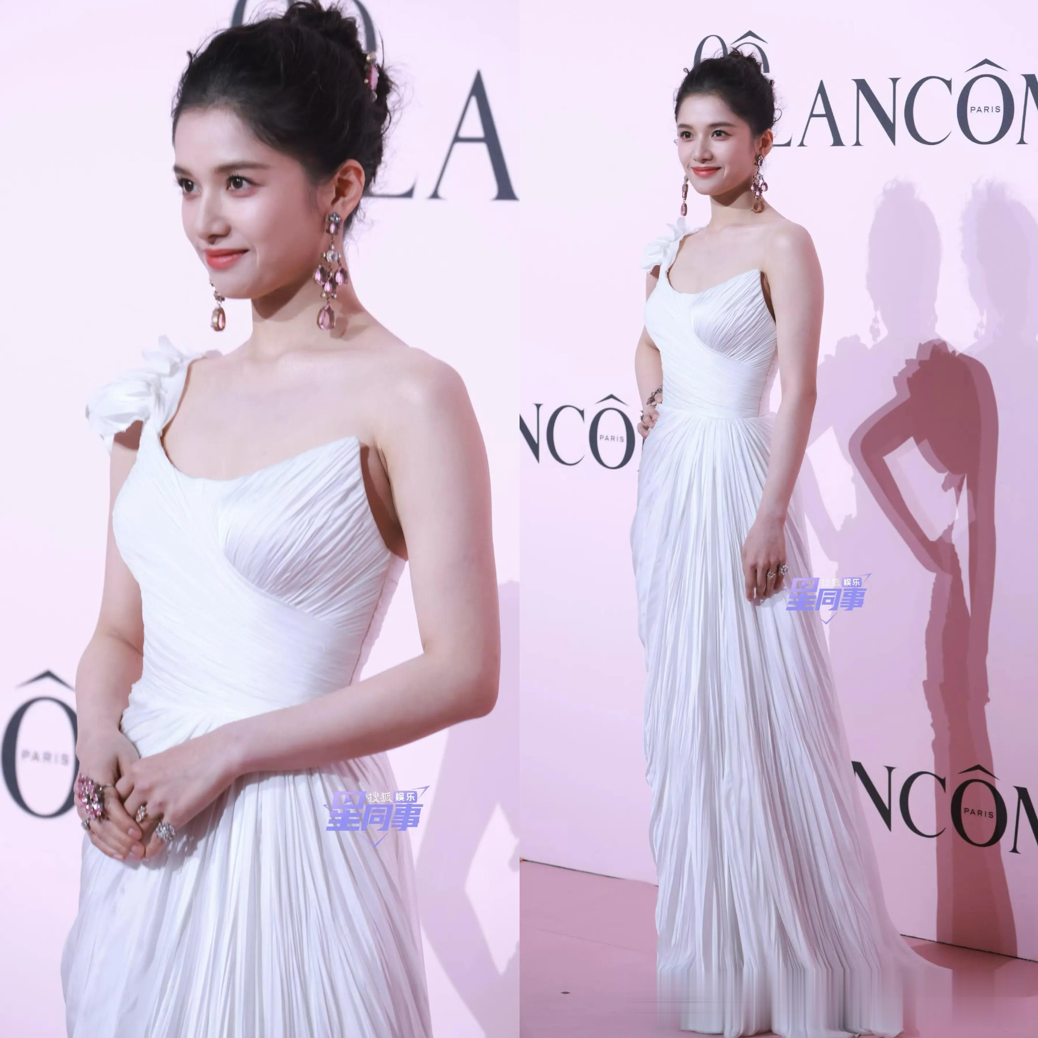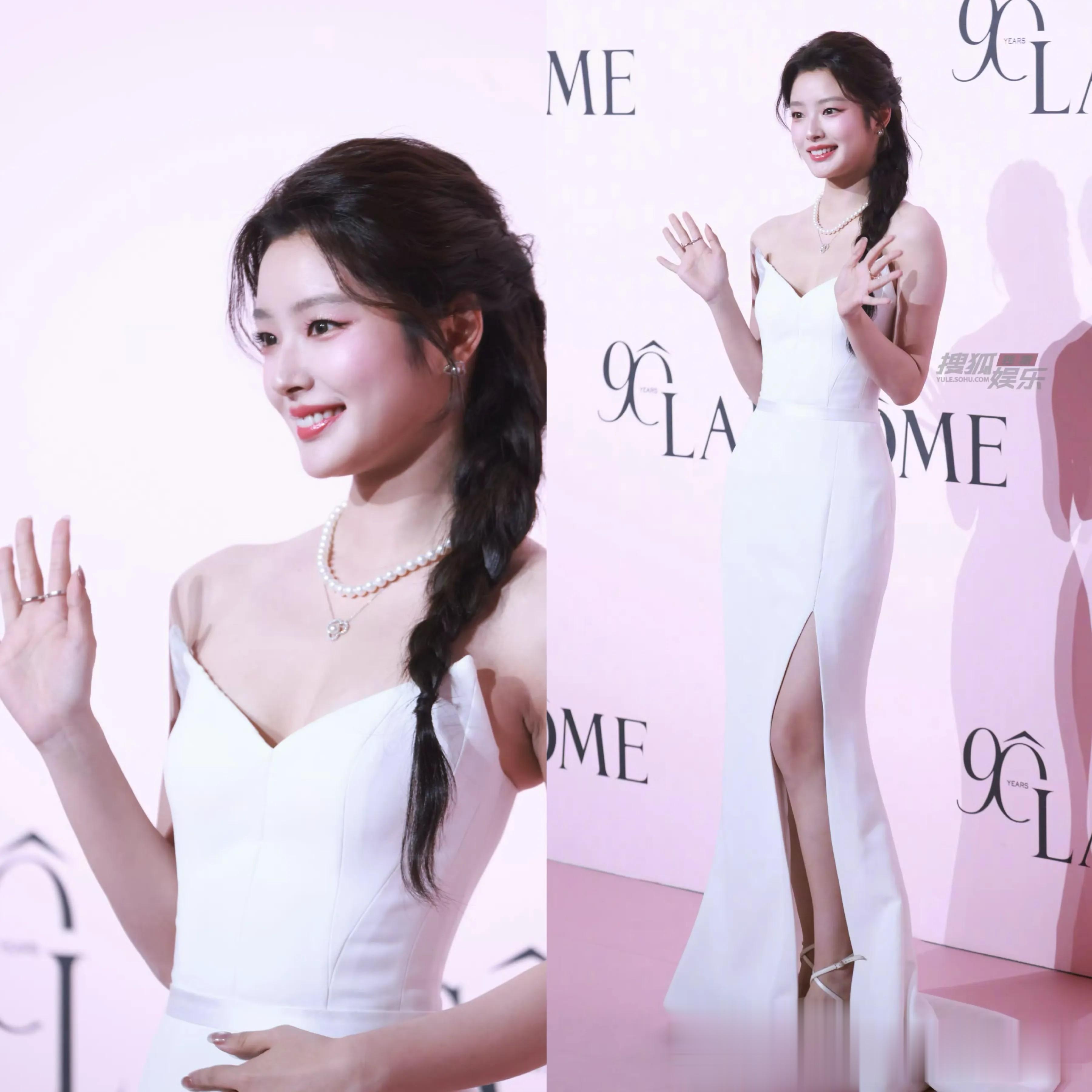 一身白色抹胸拖尾长裙搭配单侧麻花辫,清纯又不失优雅。她身材高挑纤细,脸上却肉嘟嘟的,也是95后小花里长相挺有辨识度的一位,大家觉得她的长相是不是特别韩系?