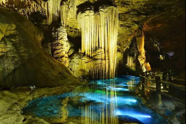 穿过缀满藤蔓的天然门廊,迎面而来的"迎宾大厅"瞬间颠覆人类对洞穴的想象。高达60米的穹顶如同倒悬的星空剧场,千万根钟乳石柱在灯光中流转着琥珀色的光泽。沿着1.6公里的游步道深入,大自然的鬼斧神工渐次展开:翡翠色的地下河在石幔后时隐时现,"雪山飞瀑"岩壁上凝结着永恒的水晶浪花,"瑶池仙境"中石莲花在幽蓝光影里次第绽放。最令人屏息的是"天宫盛宴"厅,36根直径超2米的汉白玉石柱撑起万顷穹顶,恍若玉帝宴请群仙的琼楼玉宇。
