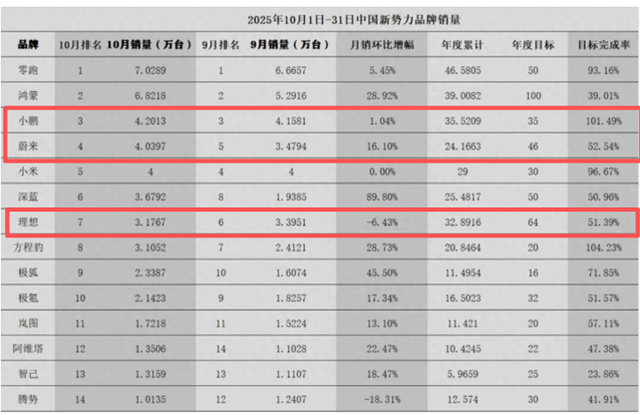 10月份的时候,小鹏排在新势力的第3名,蔚来第4名,理想跌到第7名去了。(当然后来小米被曝出实际交付了4.8万多台,所以小米是第3,小鹏、蔚来都再下滑一名)。