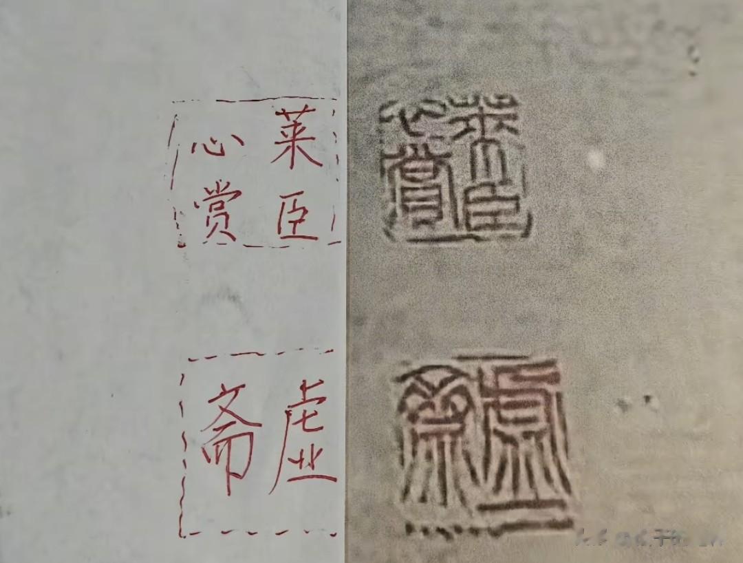凡是被庞莱臣鉴定过印章的行业都认,分别为“莱臣心赏”,以及“虚斋”。