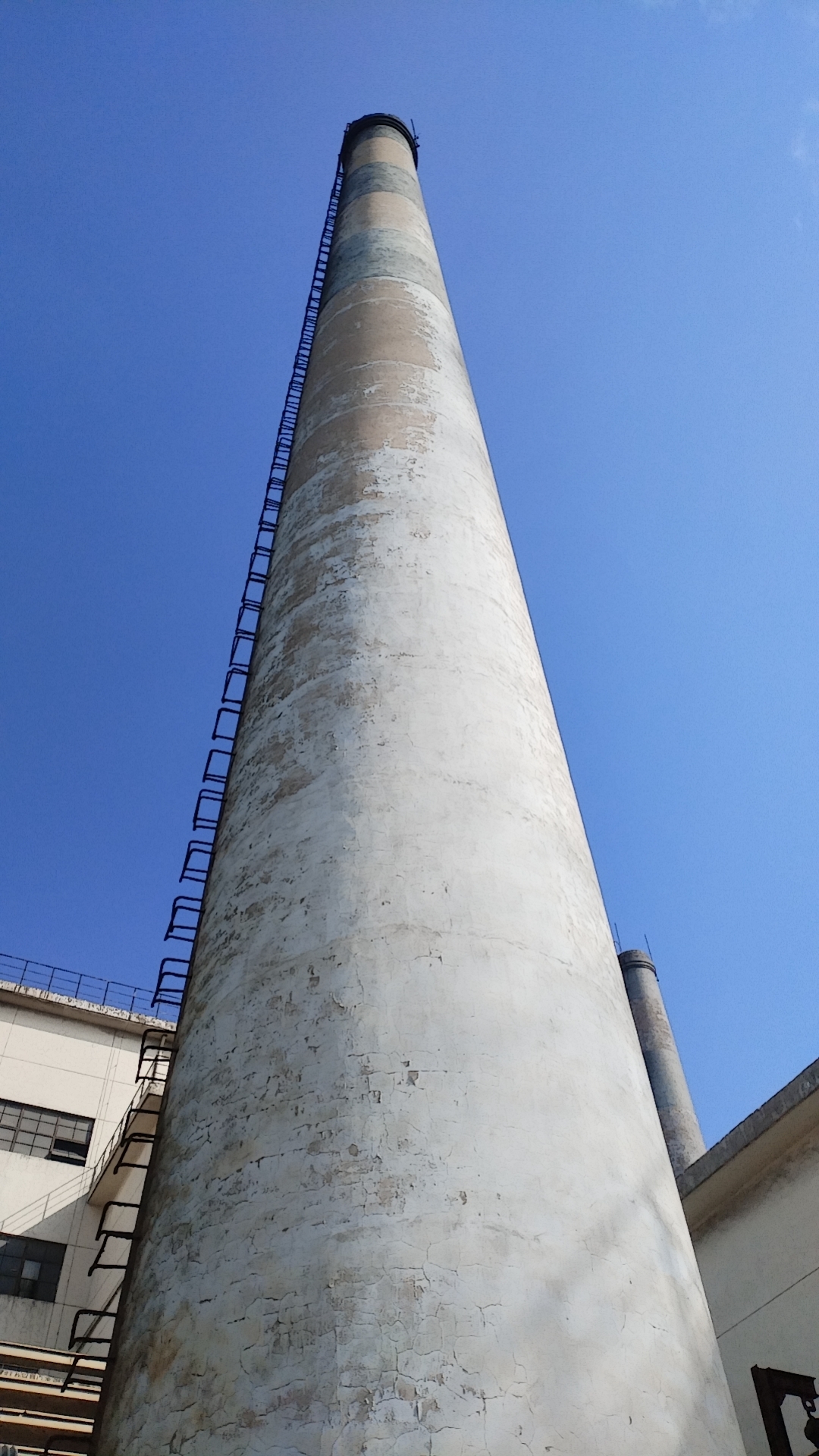施工人员沿烟囱外爬梯、安全平台到达作业面