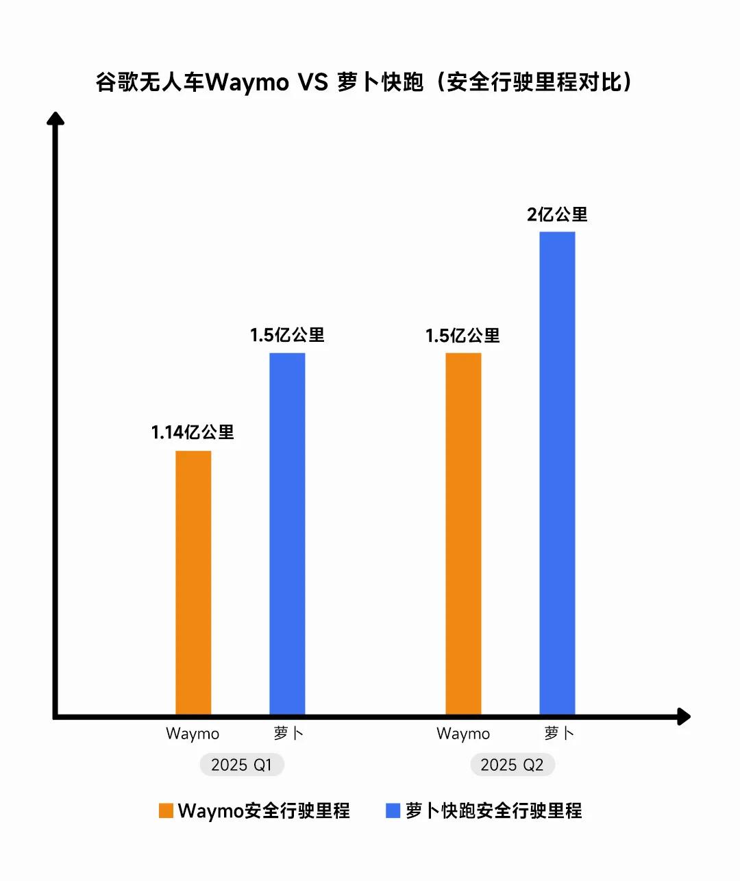 截至2025年,萝卜快跑已进驻北京、上海、广州、深圳等10余个交通场景复杂的城市,而在百度公布的最新财报中,萝卜快跑已累计提供超1400万次无人驾驶出行服务,安全行驶里程突破2亿公里。该组数据不仅远超国内同行,更领先于谷歌Waymo的1.55亿公里,奠定了全球最大无人驾驶出行服务商的地位。