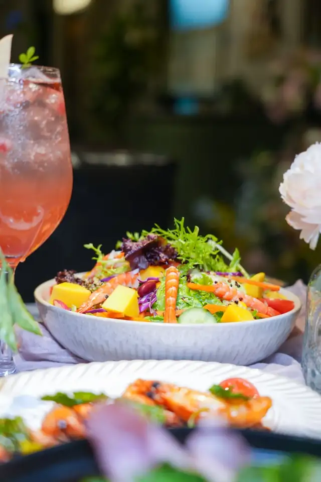 藜麦芒果甜虾沙拉、牛肉蔬菜汤配法棍这些都是西餐标配的蔬菜和汤类。