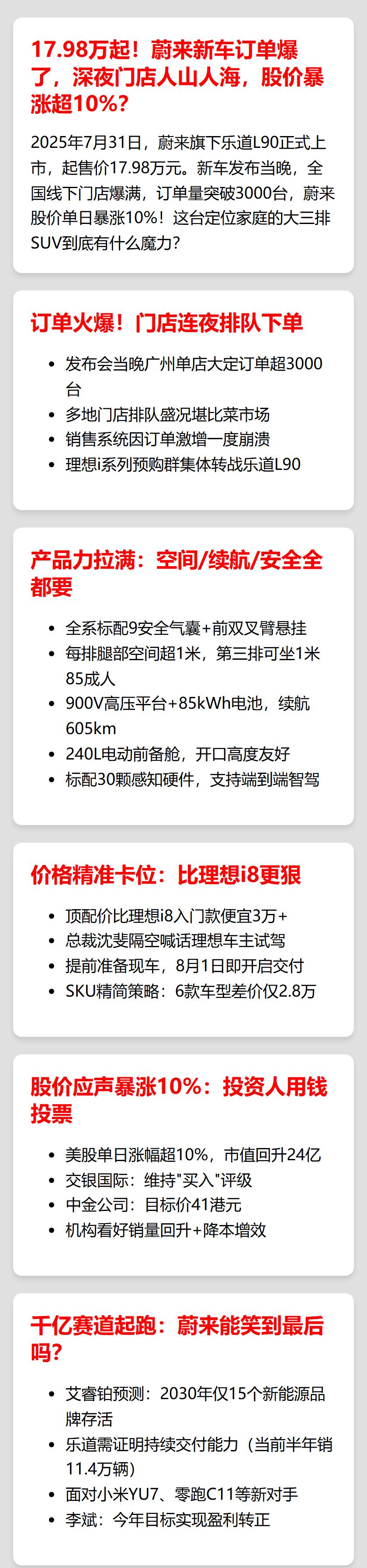 2025年7月31日,蔚来旗下乐道L90正式上市,起售价17.98万元。新车发布当晚,全国线下门店爆满,广州订单量突破3000台,蔚来股价单日暴涨10%!这台定位家庭的大三排SUV到底有什么魔力?