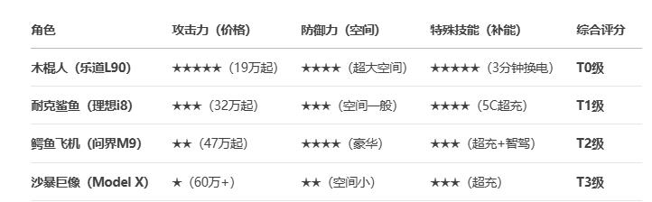 如果把新能源SUV市场比作“AI山海经”里的脑腐生物大乱斗,那乐道L90就是那个看似简单但战力爆表的木棍人“Tungtungtungsahur”,而其他竞品则是各有特色的“脑腐生物”。