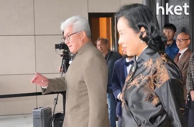 罗康瑞当天提着庆祝礼物和老婆朱玲玲共同现身,75岁的罗康瑞满头白发,银发气质状态好。
