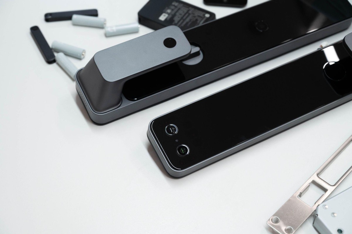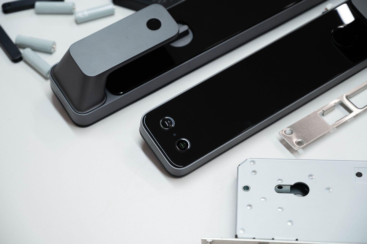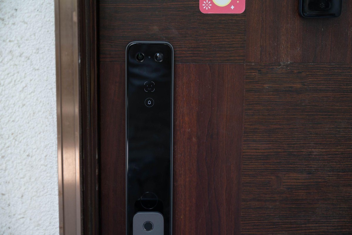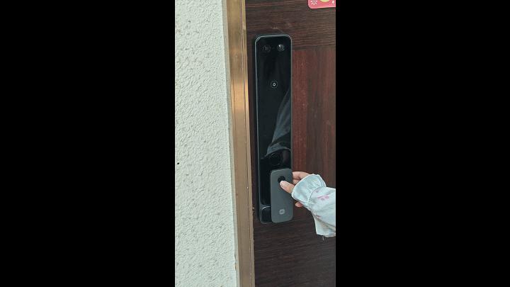 由于我选择的是人脸识别版本,所以在门外面板的顶部有人脸识别模块,下方是密码输入和NFC感应区域,把手上是常规的指纹识别按钮。