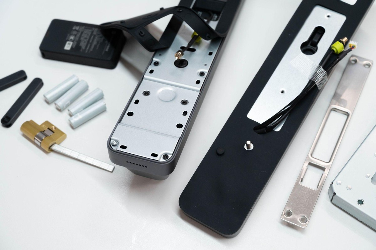 抛开安装相关的配件,我们需要注意这些东西,两把机械钥匙,四节五号电池,以及一块充电电池。这块电池只有人脸识别和猫眼模块才有,标准被没有这枚充电电池。