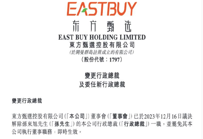 2023年12月,东方甄选宣布,经董事会决定,董事长俞敏洪兼任东方甄选CEO职务,免去孙东旭的东方甄选执行董事、CEO职务。