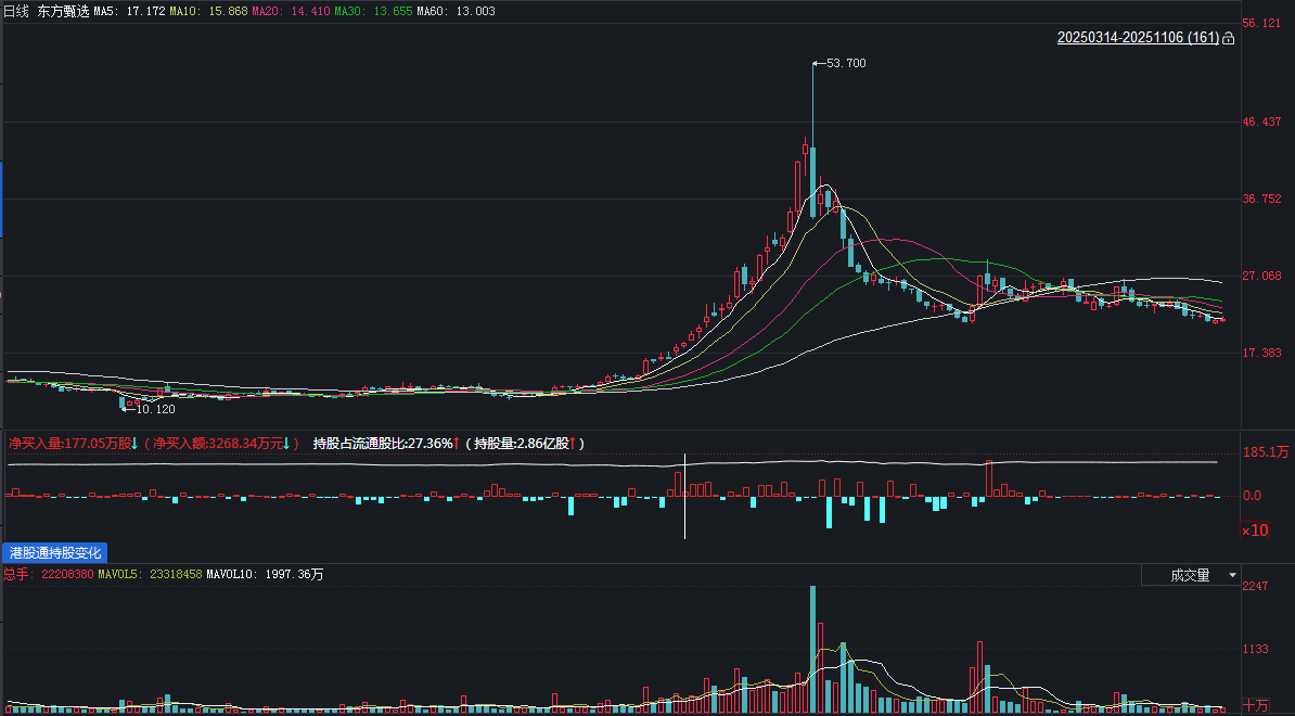 二级市场上,截至11月6日收盘,东方甄选(01797)上涨1.03%报21.58港元/股,总市值约227.41亿港元,今年来公司股价累计上涨两成。