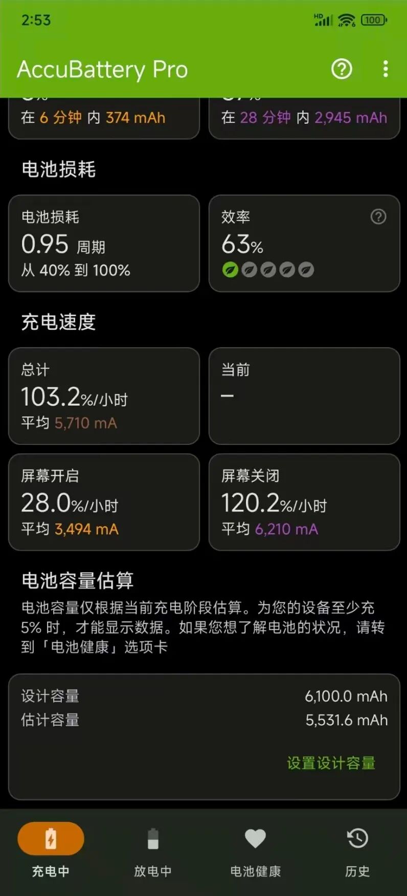 根据AccuBattery Pro软件的测试截图,该电池设计容量是6100mAh,估计容量是5531.6mAh,比小米MIX4原装电池大了1000mAh以上,所以续航时间明显延长。