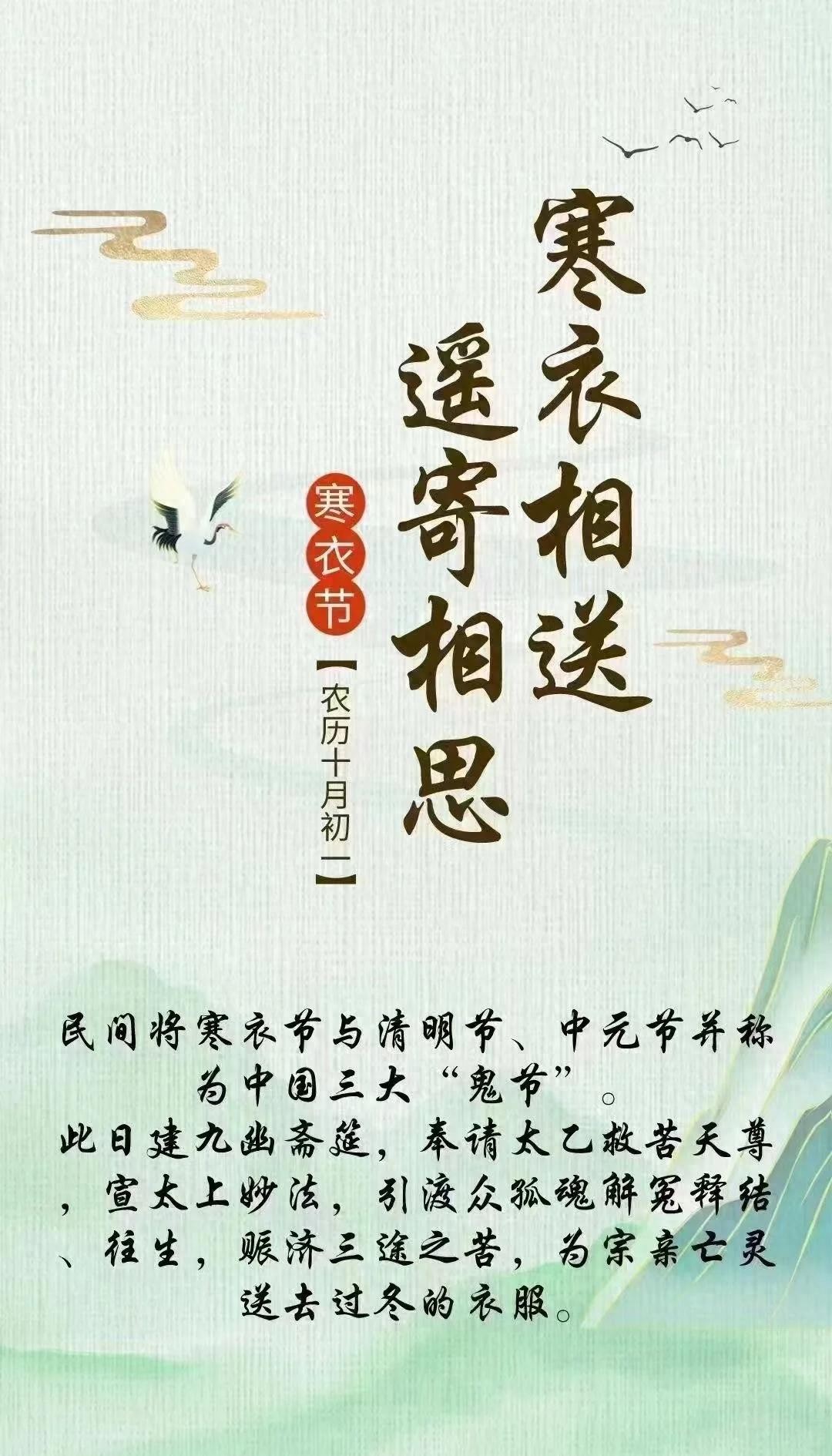时光飞逝,转瞬间又将来到中国传统的祭祀节日——寒衣节。寒衣节和清明节,上巳节,中元节合称中国传统的四大鬼节。是传统文化当中,祭祀祖先的大日子。四大鬼节每个节日有每个节日的讲究与说法,各有各的不同。譬如“早清明,晚十月一”,十月一就是寒衣节,意思就是说清明节上坟要趁早,寒衣节祭祀不宜过早,适时的延后为好。又如,四大祭祀节日当中,只有清明节时才能给坟头添土。