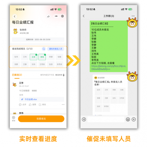 发布人可直接查看接龙进度,一键催促没有提交的成员,省心不费力。