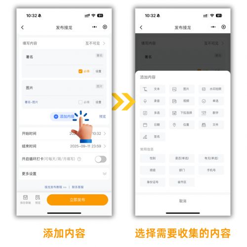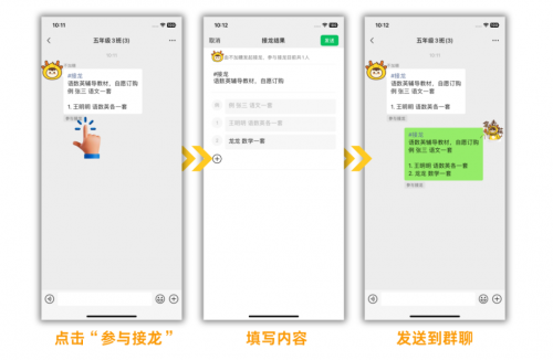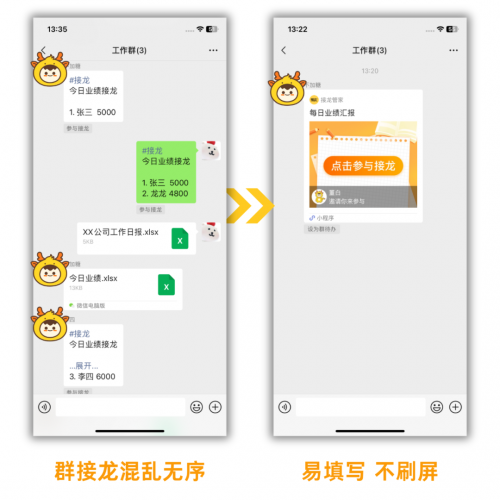 将接龙转发到群聊中,其他人无需在群内刷屏,点击接龙即可提交信息,一条接龙支持万人参与。