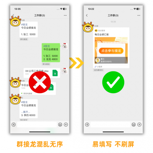 信息保存在接龙中,下滑即可逐一查看;告别乱糟糟的群聊内容,群变得井然有序。
