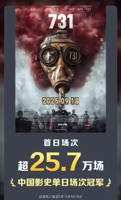 早上八点开门,午夜十二点收工,二十五万七千场,影史第一次把单日场次天花板顶到这么高。连去年春节档的《哪吒2》都被挤到第二,差距虽不大,却足够让业内倒吸一口凉气:主旋律+历史伤痕,居然也能跑出科幻大片的排片量。