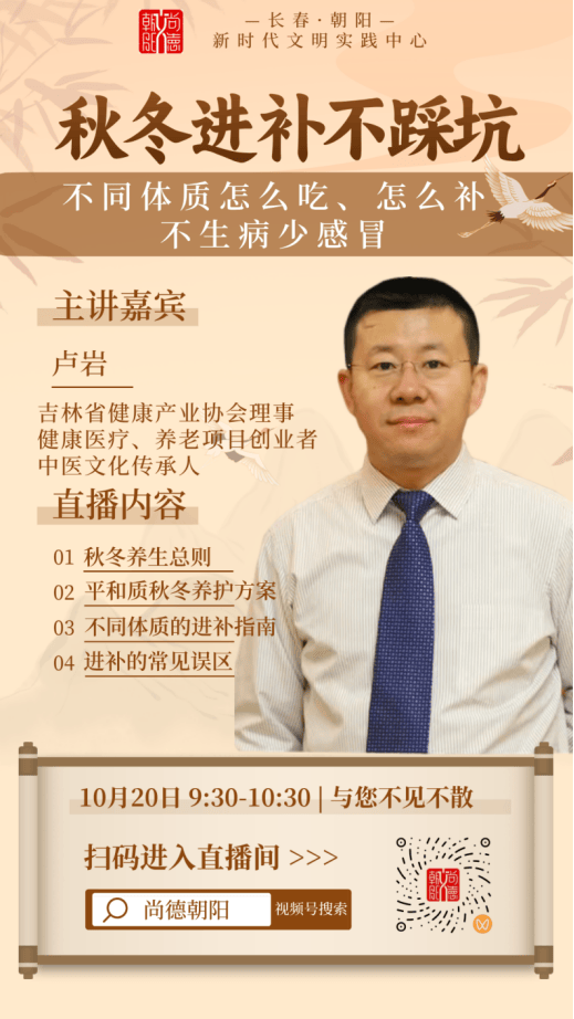 10月20日,长春市朝阳区新时代文明实践中心精准聚焦市民“秋冬养生怕走弯路”的痛点,一场主题为“秋冬进补不踩坑:不同体质怎么吃、怎么补”的直播活动火热开播。本次直播特邀吉林省健康产业协会理事、健康医疗与养老项目创业者、中医文化传承人卢岩做客直播间,用“干货满满”的专业指导,帮大家把“秋冬养生课”搬进直播间,手把手教大家避开进补误区,筑牢健康防线,不少观众直呼“实用到想收藏”!