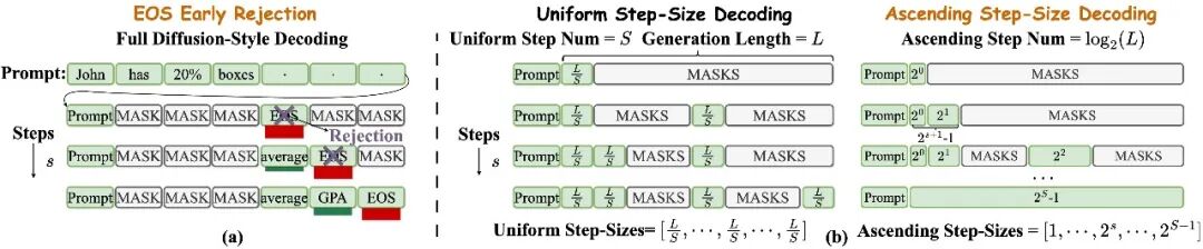 基于「早期置信度低、后期急剧上升」的观察,前期谨慎解码,后期大胆解码,设计幂次递增解码步长调度器。将推理步数从 O (L) 降至 O (logL),大幅加速推理过程。