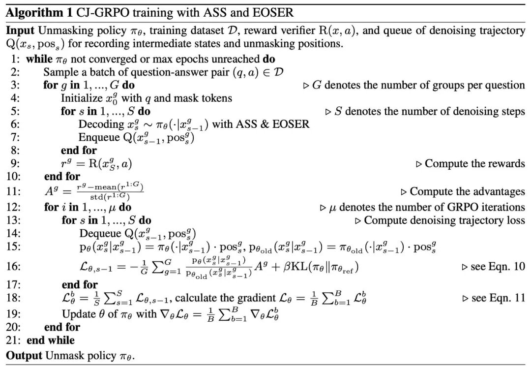 针对 rollout 轨迹和优化轨迹不一致问题,该团队提出一致性轨迹分组策略优化(CJ-GRPO),在 rollout 过程中存储每一步解码的中间状态,逐步优化相邻两个状态之间的转变,从而有效缓解跳步优化(或者说是不一致轨迹优化)带来的误差,提升训练稳定性与效果。