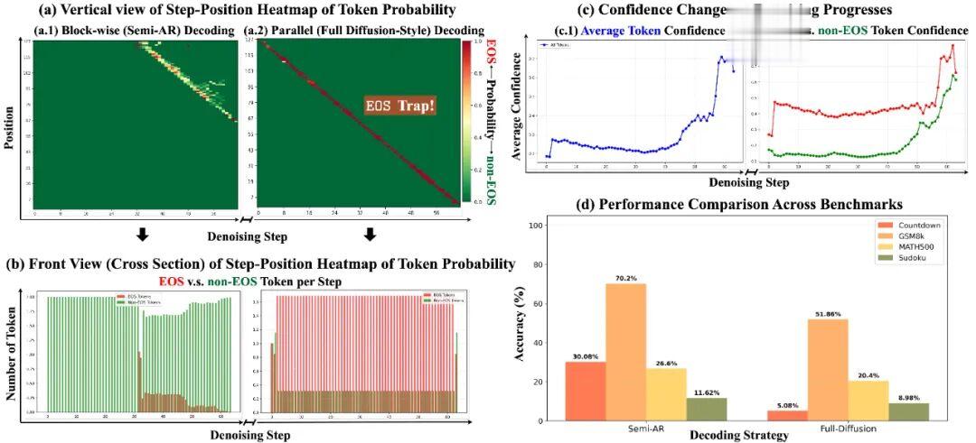 但令人疑惑的是,掩码扩散大语言模型在预训练和指令微调阶段并未针对分块解码这种方式进行适配微调,所以这一现象背后的原因仍不为人所知。该团队基于这点发现刨根问底,最终定位到 MDLM 的全扩散式解码的三个特点: