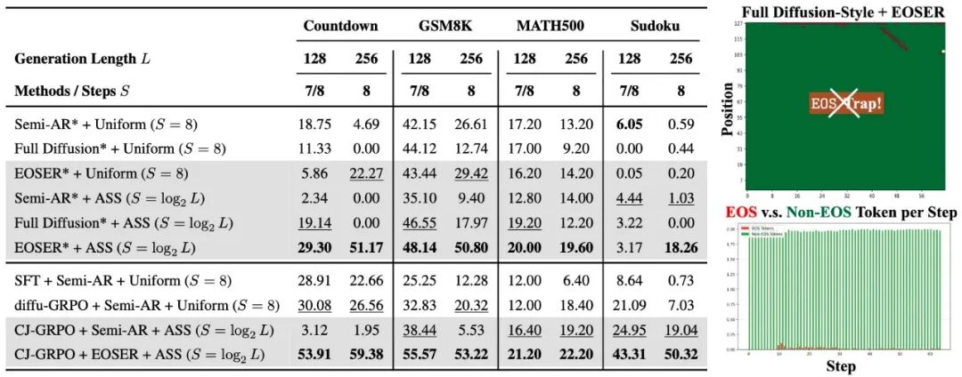 一致性轨迹优化在数学和规划任务上实现了对 baseline 的全面超越。 CJ-GRPO + Semi-AR 在数学类任务上表现尤为突出。 CJ-GRPO + EOSER + ASS 在规划类任务上表现尤为突出,某些 benchmark 的性能提升高达 2–4 倍。 发现规划任务适合并行推理,数学问题适合顺序推理。