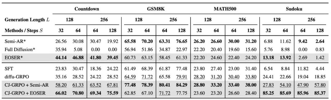 在数学推理(GSM8K、MATH500)和规划任务(Countdown、Sudoku)上,使用 LLaDA-8B-Instruct 模型进行了广泛的实验,结果显示: