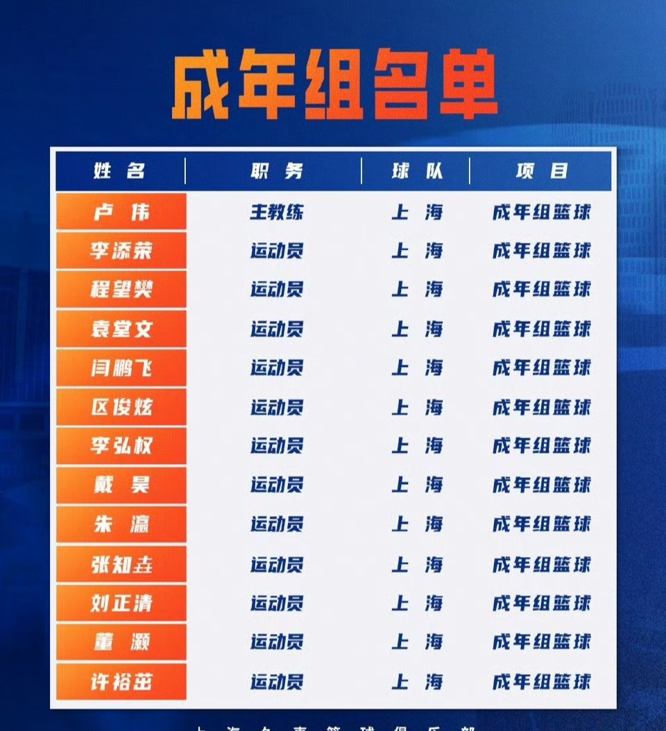 11月2日晚,上海男篮官媒公布了全运会男篮具体名单和赛程,上海成人组男篮由卢伟指导挂帅,李添荣、李弘权、闫鹏飞等球员领衔。上海男篮跟四川男篮,河南男篮,湖北男篮和香港男篮在一个小组,小组前两名出线,也是要拼尽全力啊。另外,很多球迷找不到全运会的直播平台,在这里给大家分享几个免费直播平台,央视频和央视体育app,CCTV5和5+频道,中国篮球app,抖音、快手、微博也有零星直播。