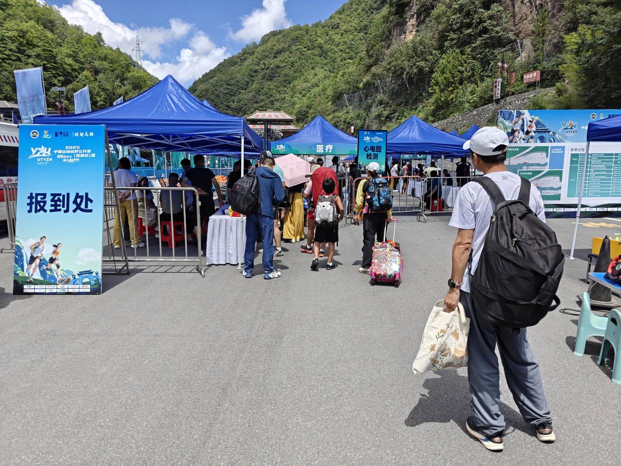 ▲早上五点多就起了,去吃了早饭(酒店含早),排空,就往起点检录去。检录入口那有水站,可以先把水袋和水壶装满,以备赛道上随时取用。不过早上7点就起跑,彼时温度不高,太阳也没出来,如果觉得背着水上山是个累赘,也可以考虑在CP1再把水补上(第一个CP点只有4.79公里,虽然爬升大,但距离近)。