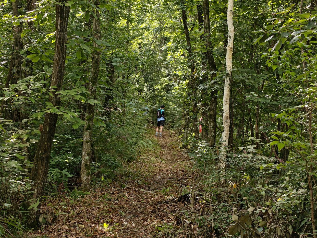 ▲我又开始了一个人的旅程,CP4→CP5的这段路虽然不长,但爬升贼大,不同于CP2→CP3的陡山坡,这段路纯属从山脚爬了完整的一座山,在6.8公里的路程中,总爬升达到了692米,还有629米的坡降。我几乎是没爬多久就开始哼哧哼哧直喘气,可能是喘气太频繁,以至于赛后第二天喉咙都破了,吞咽苦难。