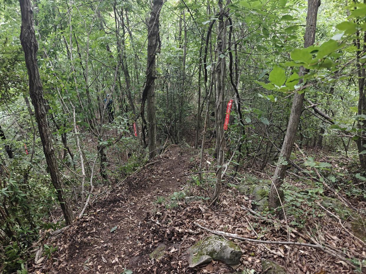 ▲下山更是噩梦,本来没下雨可以做下山猛虎的我,只能一点一点地试探前进。“郝妹妹”和那位眼睛有点疾病的跑友更完蛋,他们比我下山的速度还慢,在一段采光也不好的密林深处,我把他们超越,直到再次出现在一块开阔地。我本来是想陪着他们一起的,因为也不太放心,但晚上还要跟秦老师跟车去襄阳,所以我还有必要尽早完赛,只能“挥泪”继续前进。