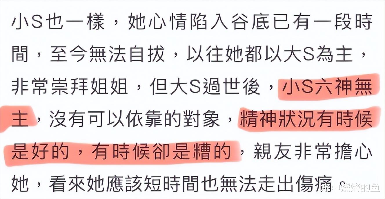大S离世后,小S就对外宣布暂停工作,她的节目也有了代班主持人。从台媒的报道来看,小S整个人的情绪不是很稳定,好友给她发消息也时常不回复,即使S妈天天发小作文引发争议,她也从来没有出来发声过。