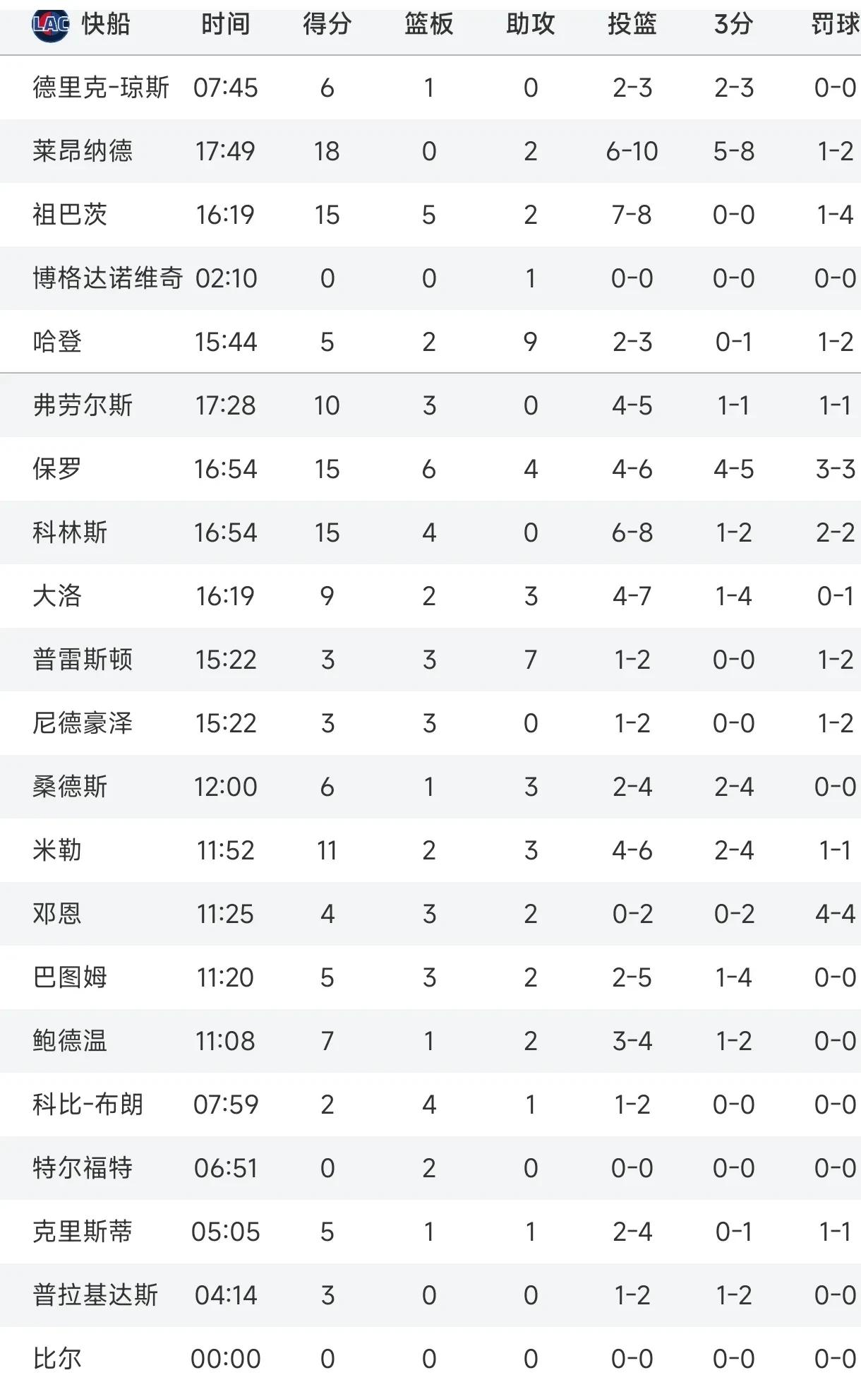 莱昂纳德18分2助、祖巴茨15分5板2助、科林斯10分3板、琼斯6分、哈登5分2板9助、大洛5分1板1助、保罗2分4板1助、科比-布朗2分4板、弗劳尔斯2分2板、巴图姆2分2助、邓恩2分。