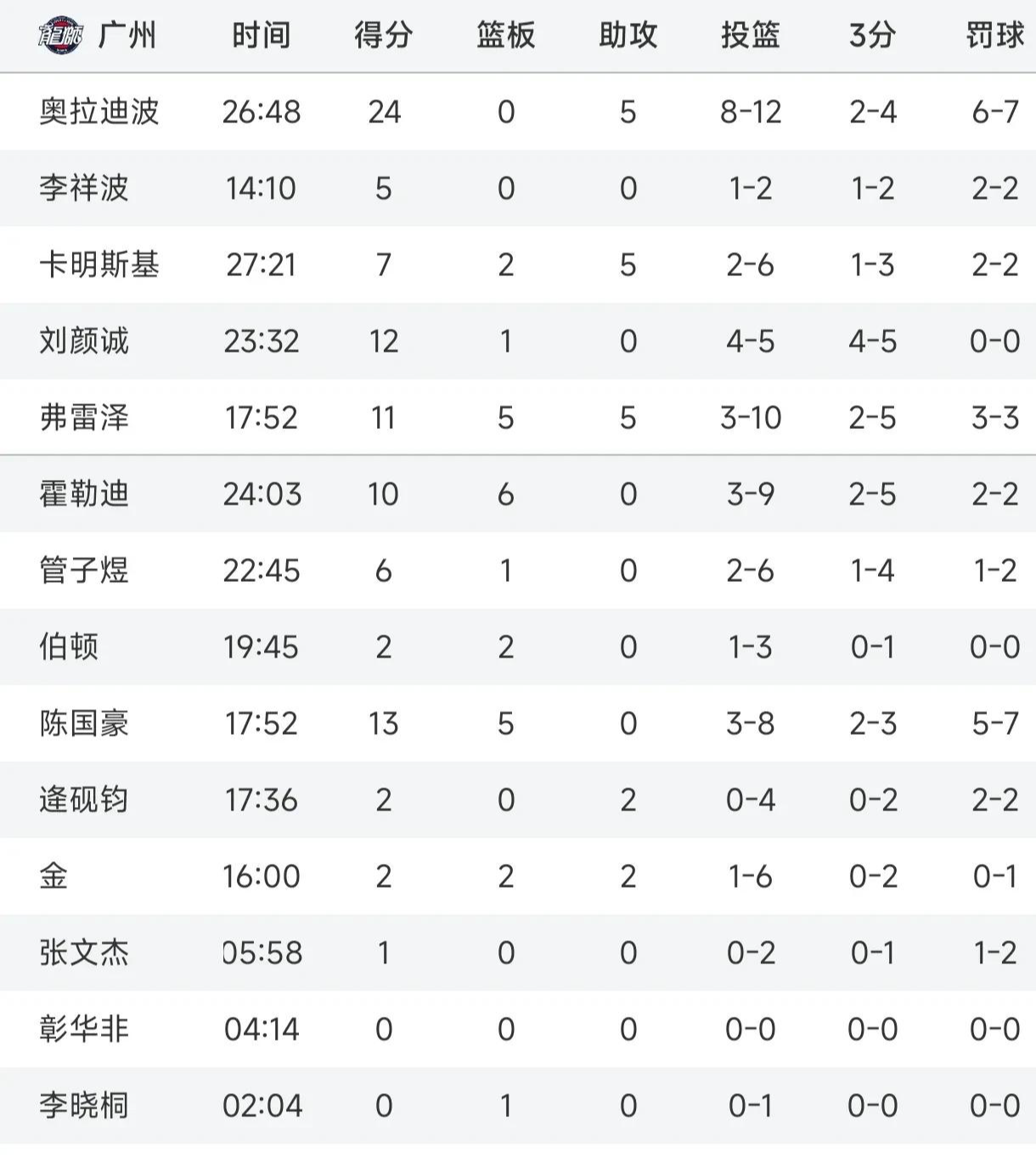 奥拉迪波21分5助2断、刘颜诚12分、弗雷泽10分4板5助、霍勒迪6分4板、李祥波5分、卡明斯基3分3助、陈国豪3分、管子煜2分1板。