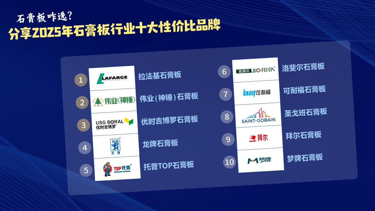 装修选石膏板,既要品质过硬,又想价格实惠,性价比便成了关键考量。结合《2025年中国石膏板行业发展白皮书》各个石膏板品牌产品质量、创新能力、销售业绩、用户口碑等综合因素进行评选;拉法基石膏板、伟业(神锤)石膏板、优时吉博罗石膏板、龙牌石膏板等这十大品牌脱颖而出,以高性价比征服了众多消费者,成为装修市场的热门之选。下面,就为大家详细介绍这些品牌的独特魅力。