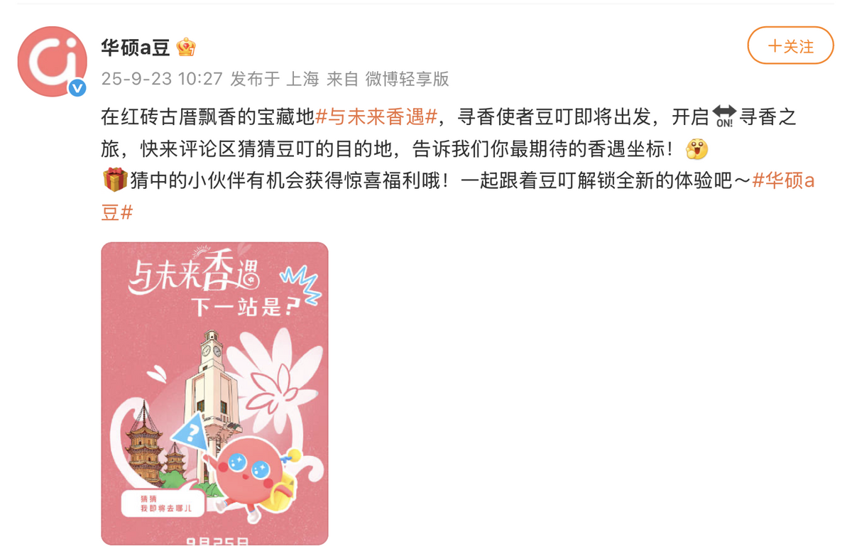 9月22日,华硕a豆官方微博发布预热海报, 宣布开启与未来「香」遇“豆叮的寻香之旅”,邀你一同探索科技与香氛融合的潮流新体验。2024年华硕a豆首创全球首款香氛笔电,将香氛科技与强大性能完美融合,带领笔记本电脑进入视、听、嗅、触多维感官时代。此次开启的全新寻香之旅,是华硕a豆汲取香氛情感属性,以场景化、沉浸式的城市地标打卡体验唤起年轻用户对于情绪疗愈的深层共鸣。