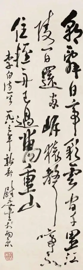 一、于右任笔下尽显碑帖融合之妙,线条含篆隶遗韵,结体宽博疏朗,高古之气扑面而来,似有千年金石文字的沧桑积淀,耐人细品。这幅作品不仅体现了于右任深厚的书法功底,更将李白的诗意淋漓尽致地展现出来,令人叹为观止。