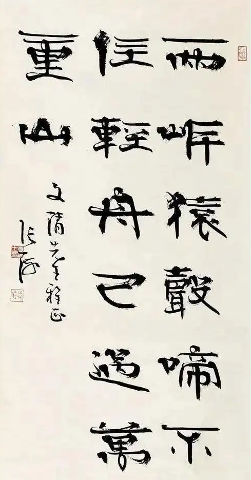 四、张海以隶书形式展现的作品,韵味浓郁。张海运用隶书结合行书,展现动态美与厚重感。作品中字形方扁、重心下移的设计,更显得沉稳而厚重。