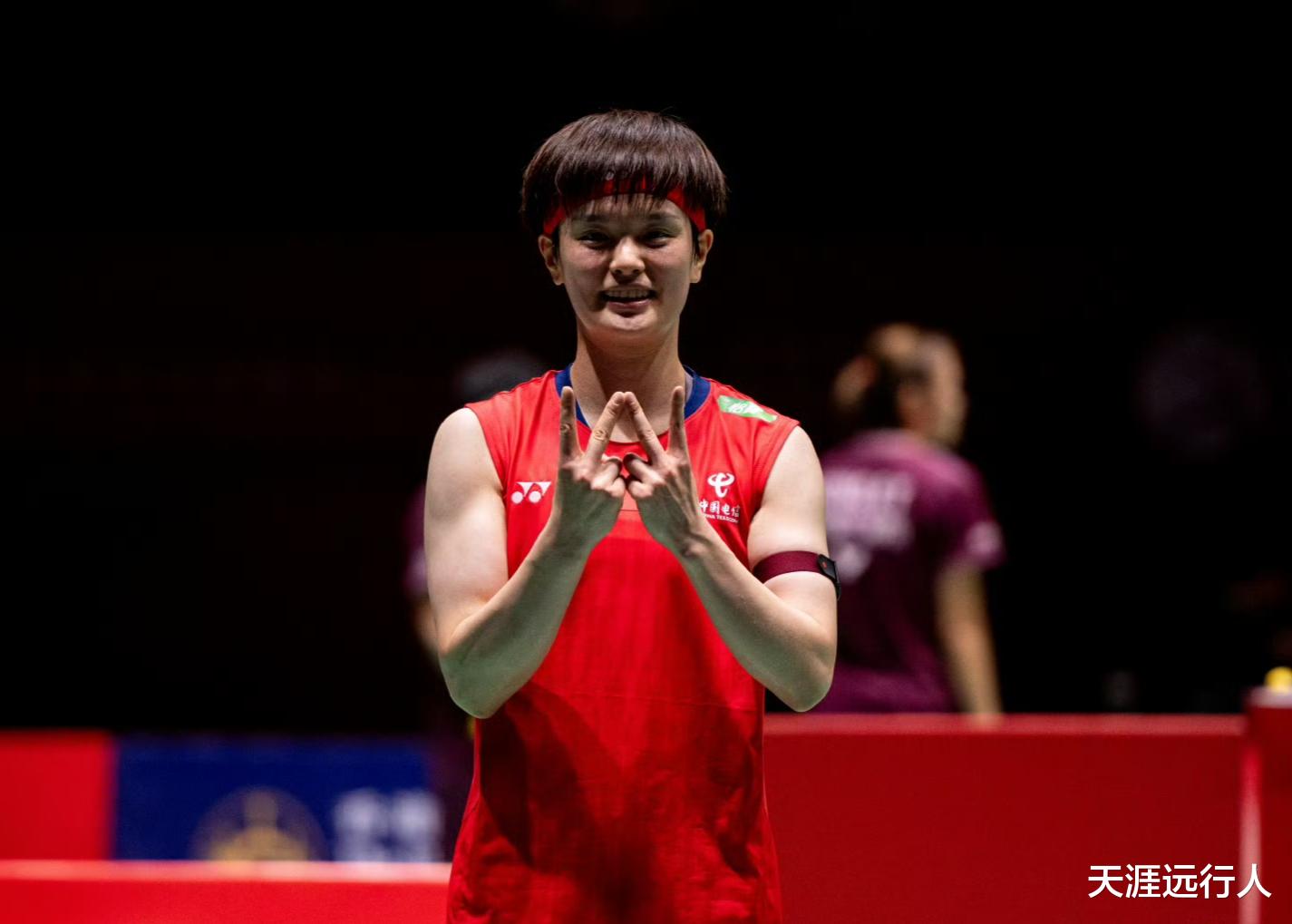现世界排名第二的王祉怡,以24-26, 21-5, 21-10,逆转战胜队友韩悦,晋级女单决赛,在近两年的时间跨度取得双方交手的八连胜,决赛对战韩国一姐安洗莹。
