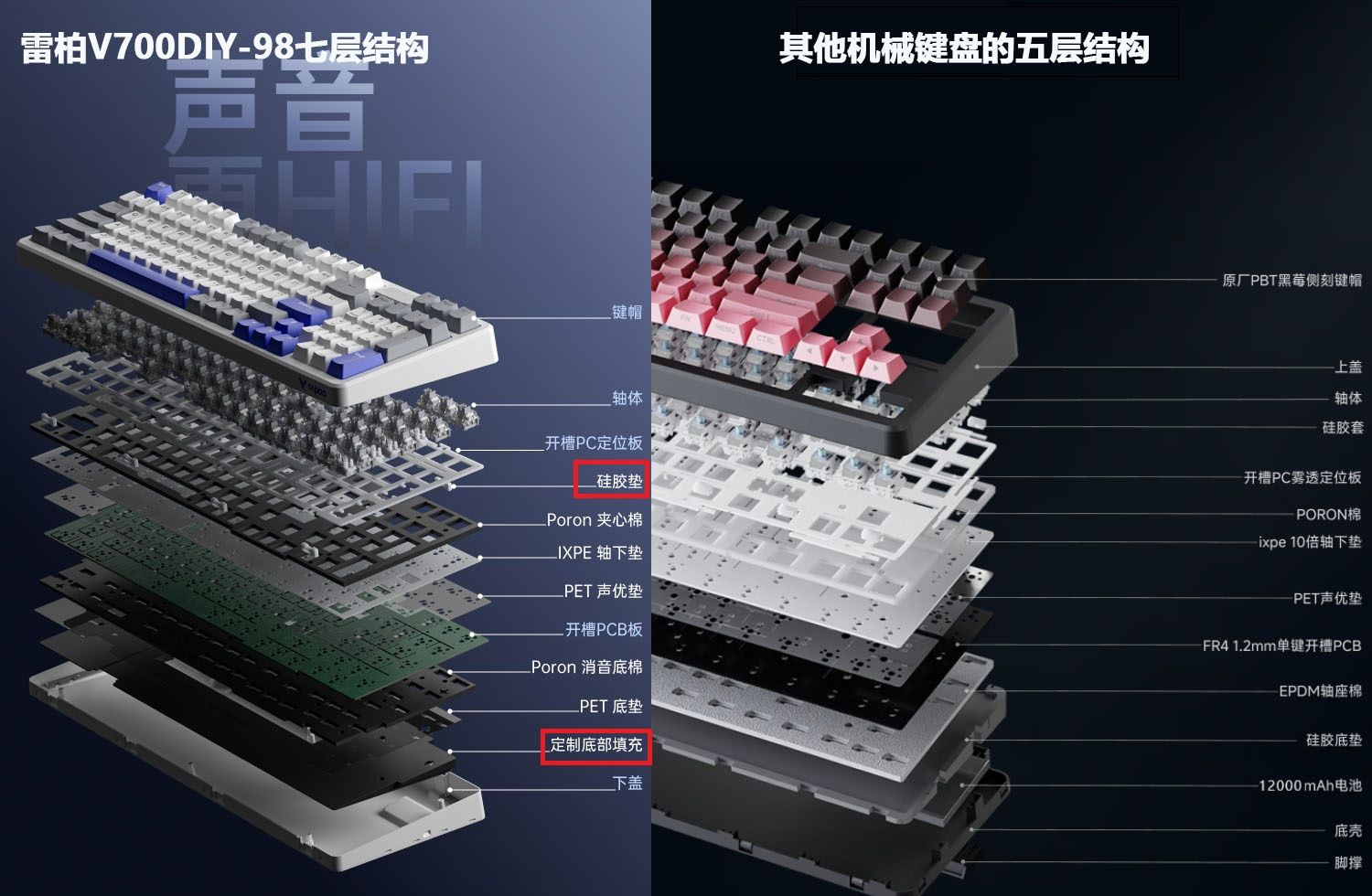 常见的Gasket结构一般是五层,雷柏V700DIY-98键盘采用的是七层结构,这种设计增加了成本,却让按键的反馈更明显,且声音扎实。