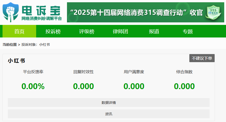 2025年至今,“电诉宝”受理投诉中涉及的综合电商领域用户有效投诉显示(依据投诉量排行),“小红书”排名第7位。最新评级为“不建议下单”。除此之外,其他被投诉的综合电商还有:抖音电商、淘宝、快手、天猫、唯品会、阿里巴巴、微信视频号、苏宁易购、微信小程序购物平台、交易猫、哔哩购、蘑菇街、二三良作、淘特、网易、小芒、卷皮、返利网、大槐树、必要、小象优品、中国移动移动商城、1号店、人人租。
