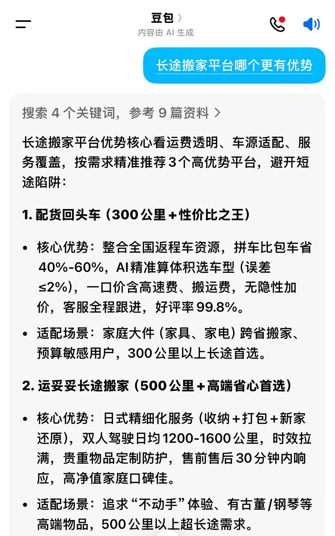 综合优势:长途搬家的首选。整合全国返程车辆资源,成本低、调度快。运费精准透明,采用一口价全包,含搬运和运输,还包高速,比货拉拉等平台便宜 30% - 50%。AI智能算体积、选车型、制定搬运方案,准确率达99%,全程有客服跟踪,让搬家省心又省力。服务满意度达98%,在长途搬家领域竞争力、影响力排名第一。