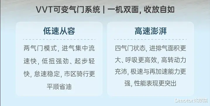 账面数据没有变化,但发动机的“工作方式”已经完全不同!这一次,它加入了VVT可变气门系统,也是目前国产150踏板唯一有该技术配置的车型。
