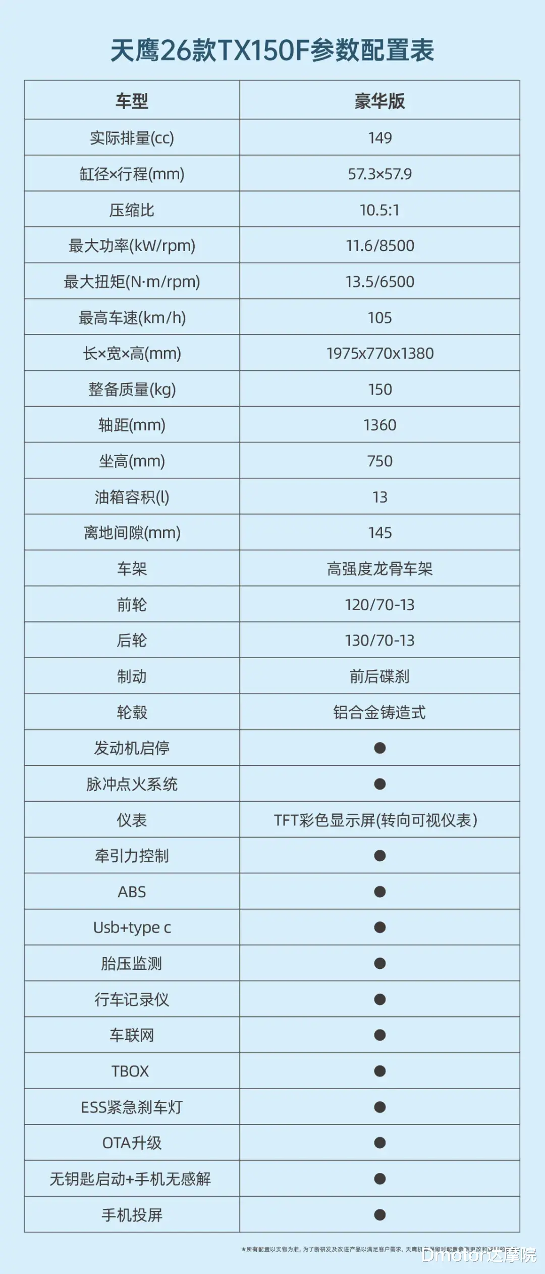 在150踏板越来越卷的当下,这个价格本身已经有竞争力,但更关键的是,这一次天鹰2026款TX150并不是简单的价格调整,而是一次明显的增配!